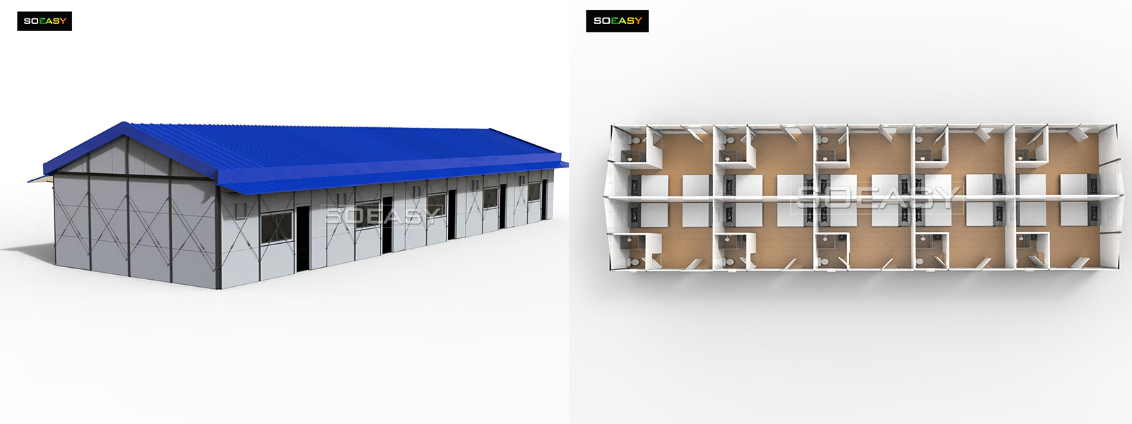 Susun Atur yang Boleh Disesuaikan Sepenuhnya: Daripada padat Asrama untuk pejabat tapak yang luas, struktur kami menyesuaikan diri dengan keperluan anda. Kami menyesuaikan saiz dan susun atur berdasarkan bilangan tenaga kerja khusus anda dan keperluan operasi, memastikan anda Kem Buruh dioptimumkan untuk fungsi.